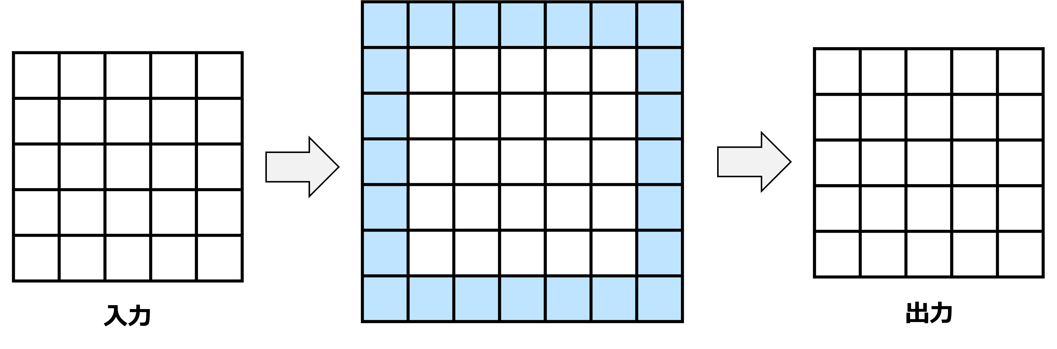 上記の例のように重みのサイズやストライド数によっては入出力の解像度が低下することがある.パディング(Padding) は入出力の解像度を揃えるために,入力画像の縁に0などの特定の値を埋めて解像度を上げるテクニックである.上記の例を使って,0で値を埋めるゼロパディングを視覚的に説明する.