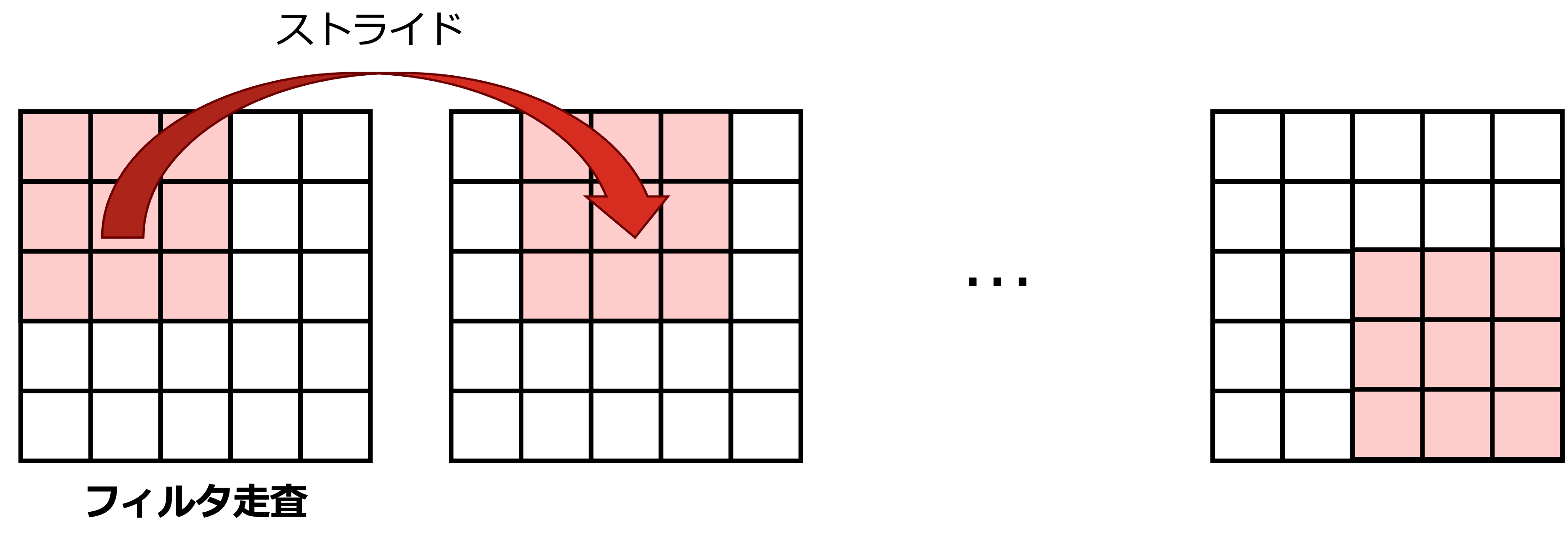 CNNにおける畳み込みの重要な性質は重みの局所性と共有化である.一般的なCNNではこれらの性質に加えて,ストライドと後述するマルチチャネル化がサポートされている.ここでは,ストライドについて紹介する.ストライド(stride) は重みをずらす量を定義する.上式では,\(a,b\) が1ずつ動いているが,ストライド付きの畳み込みでは \(s\) ずつ移動しながら重みを適用することを考える.式で書くと,