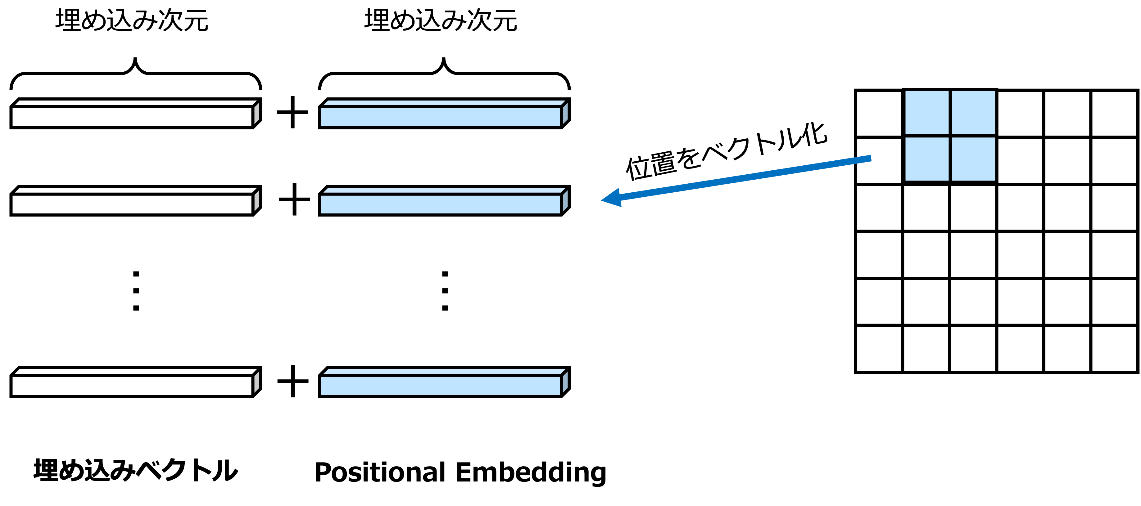 このノートブックでは,パッチ埋め込みで画像をテンソル化したことからもわかるように,このパッチが画像中のどこに位置しているか?という画像中の位置に関する情報がパッチ埋め込み化により欠落する.そこで,パッチに画像中の位置情報を付加するのが,位置埋め込み(Positional Embedding, PE)である.