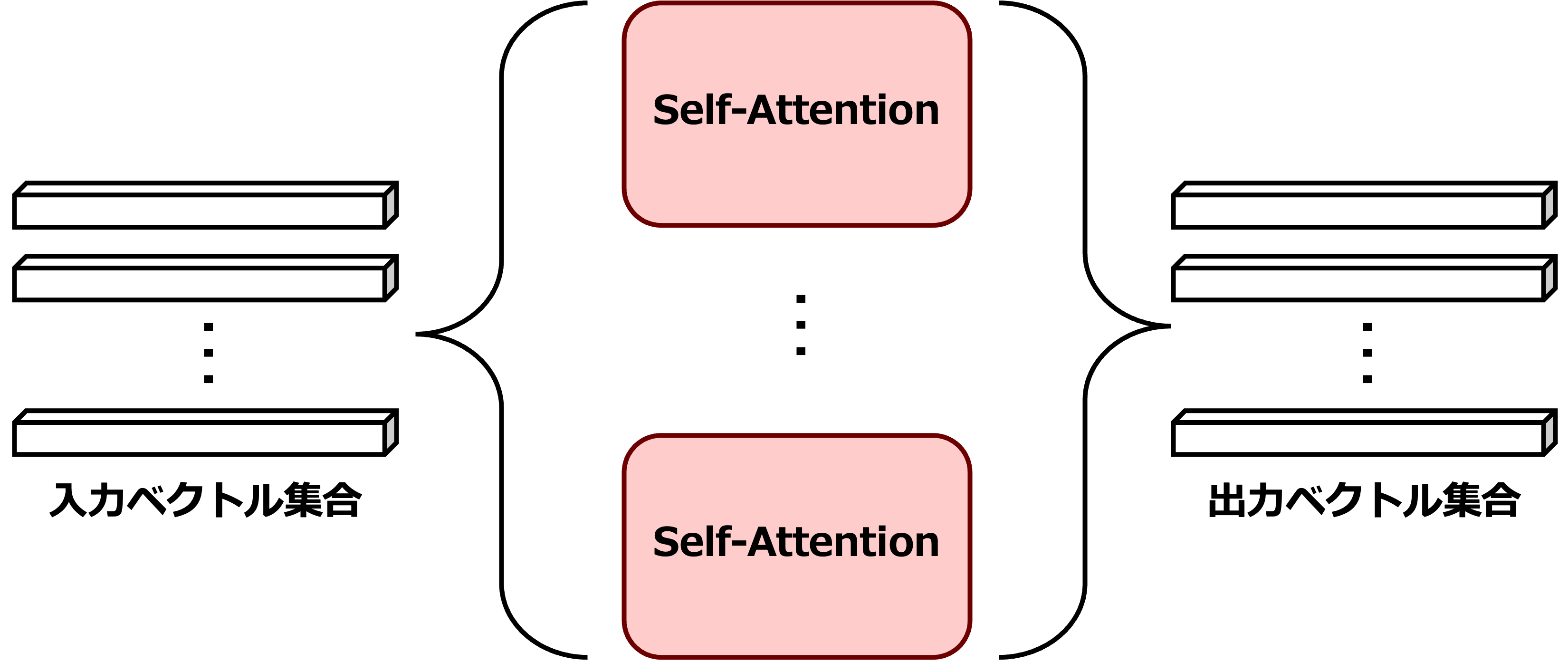 このノートブックでは,Transformerのコア要素である 自己注意機構(Self-Attention) について説明する.自己注意機構は自身のトークンと関連するトークンの情報を使って,自身のトークンの情報を強調したり,逆に減衰したり更新することができる仕組みである.そのため,自己注意機構内ではトークン間の類似度の計算と特徴の強調・減衰を行う加重和の計算が行われる.
