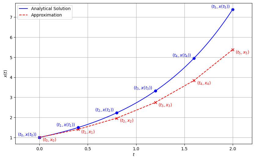 ここで,独立変数は時刻 \(t\) であり,微分方程式の初期値問題を解くとは与えられた方程式と初期条件 \(x(t=0)=\alpha\) を満たす未知関数 \(x=x(t)\) を求めることであった.本書で扱ってきた微分方程式は,不定積分を求めることにより,解析解を得ることができた.しかしながら,実際の場面では不定積分を求めることができず,解析解を求めることは困難である.そのため,コンピュータを用いて解析解の近似である数値解を求める数値解法が幅広く利用されている.